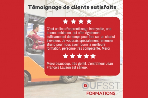 Grâce à notre équipe de conseillers et de formateurs qualifiés et expérimentés, OUFSST s’engage à offrir un service de grande qualité qui répond aux attentes et besoins spécifiques de sa clientèle en matière de formation SST. Confier ses besoins de formation cariste et opérateurs à OUFSST, c’est aussi se procurer la paix d’esprit et l’assurance de faire confiance à un organisme formateur agréé.
